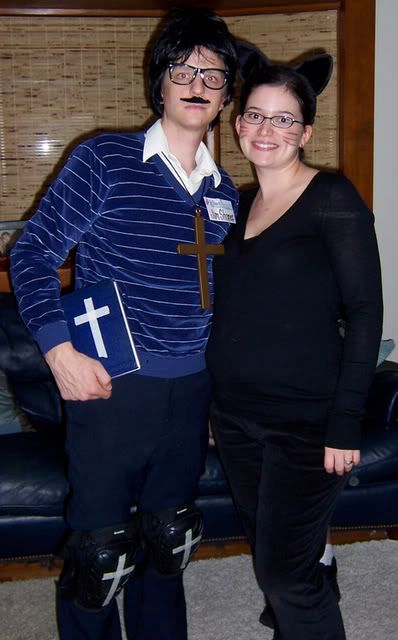 Hil was a pregnant cat and I was a Bible Camp Counselor (with his own agenda... if you know what I mean...). Hil donned cat ears and whiskers and dressed in all black. I, on the other hand, wore a cheesy wig, creepy mustache, glasses, prayer pads, and a name tag from In Touch Ministries (yes.. a real organization. A pretty unfortunate name if you ask me considering all the "things" going on in some of the catholic churches nowadays. You can click HERE to visit their page....) Bible Camp for Young Boys (I made that part up... and used the name of a friend/coworker.). I also carried a 'Bible'. I didn't have a real bible so I used the only book we had that LOOKED like it could be a bible, which was... well.. Darwin's Origin of Species. Irony not totally intended.